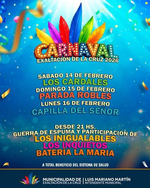 Las tres jornadas de carnaval rodeadas por la presentación de las comparsas Los Inigualables, Los Inquietos y la Batería La María, para atraer a la concurrencia con actuaciones que van a invitar a bailar y divertirse además, con la infaltable “guerra de espuma!”. Los tradicionales festejos de Carnaval, tendrán entrada libre y gratuita y lo recaudado por otros ingresos (venta de espuma) será beneficio del Sistema de Salud del municipio.