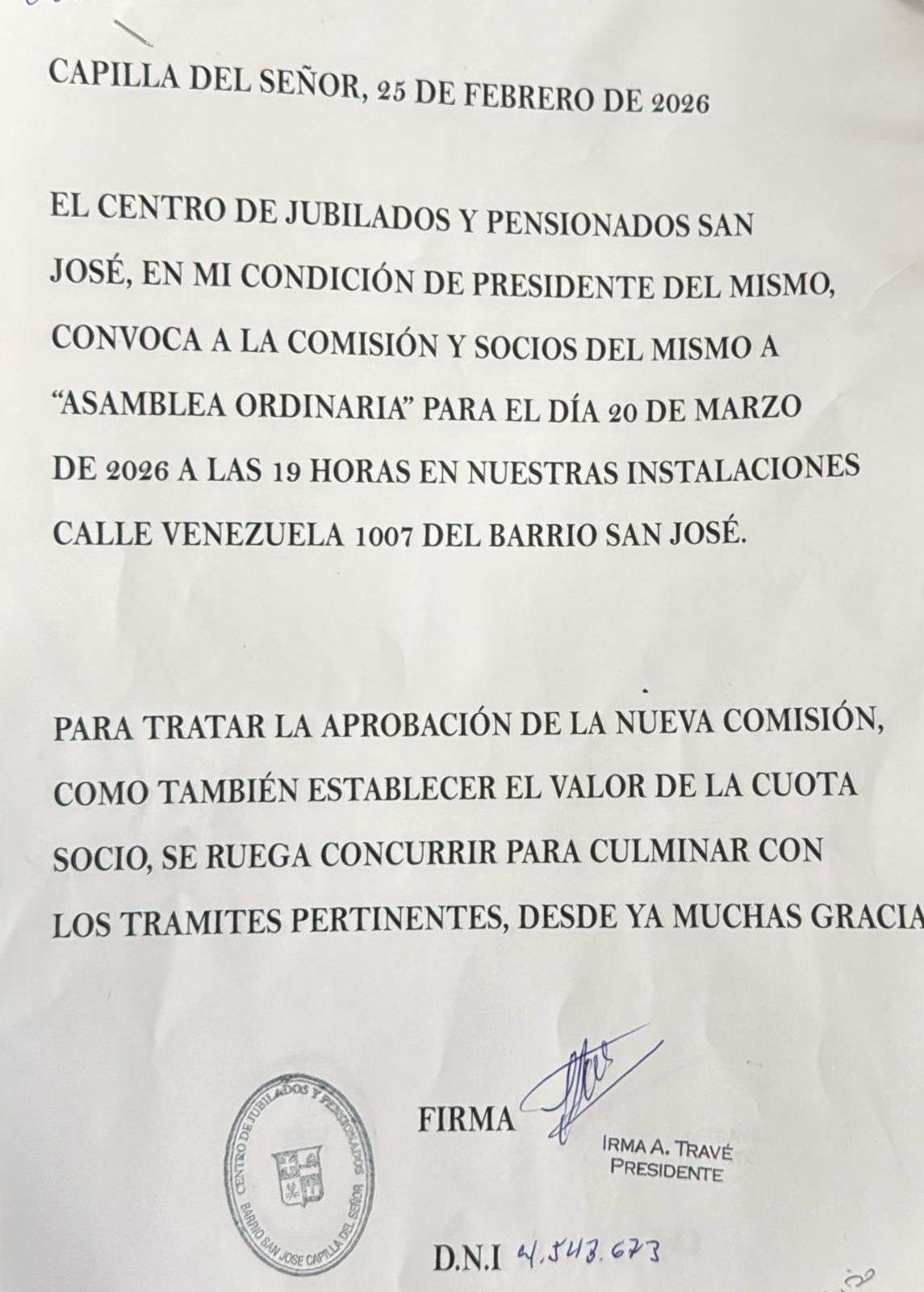 EN MI CONDICIÓN DE PRESIDENTE DE LA ENTIDAD, CONVOCA A LA COMISIÓN Y SOCIOS A “ASAMBLEA GENERAL ORDINARIA” PARA EL DÍA 20 DE MARZO DE 2026 A LAS 19 HORAS EN LA SEDE EN LA CALLE VENEZUELA 1007, BARRIO SAN JOSÉ.
