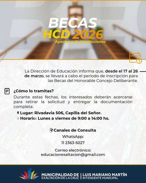 Puede retirarse para aspirar a la beca y entregar la documentación requerida en la Dirección de Educación, Rivadavia 506, Capilla del Señor. De lunes a viernes, de 9 a 14 horas.