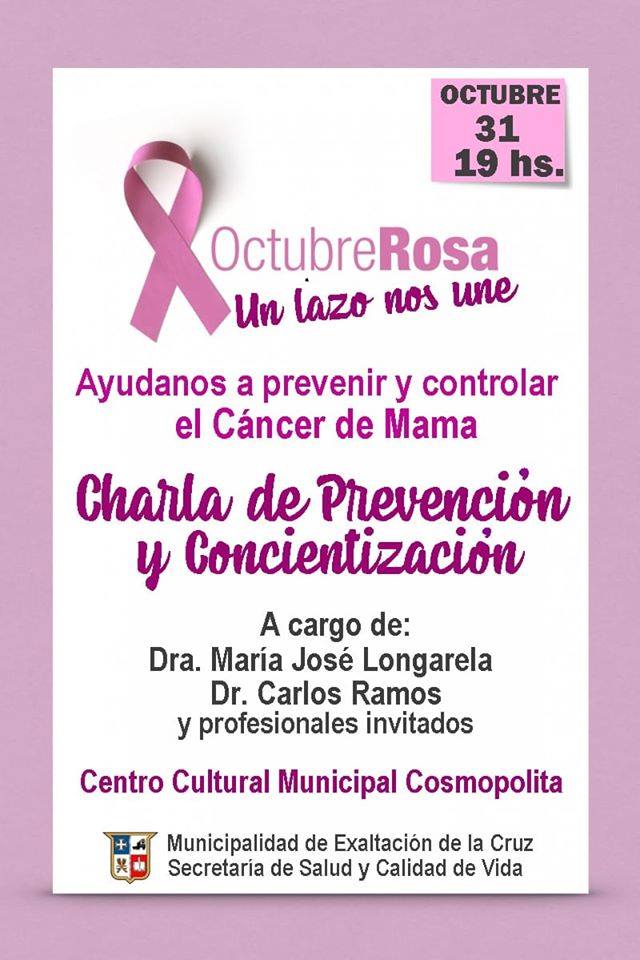 En el marco del mes internacional de la prevención y concientizaciòn del Cáncer de Mama, el 31 de octubre a las 19 tenía lugar en el Centro Cultural Municipal Cosmopolita de Capilla del Señor, la charla sobre prevención, control y concientizaciòn, organizada por la Secretarìa de Salud y Calidad de Vida del municipio de Exaltación de la Cruz, a cargo de los Dres. María José Longarela y Carlos Ramos.