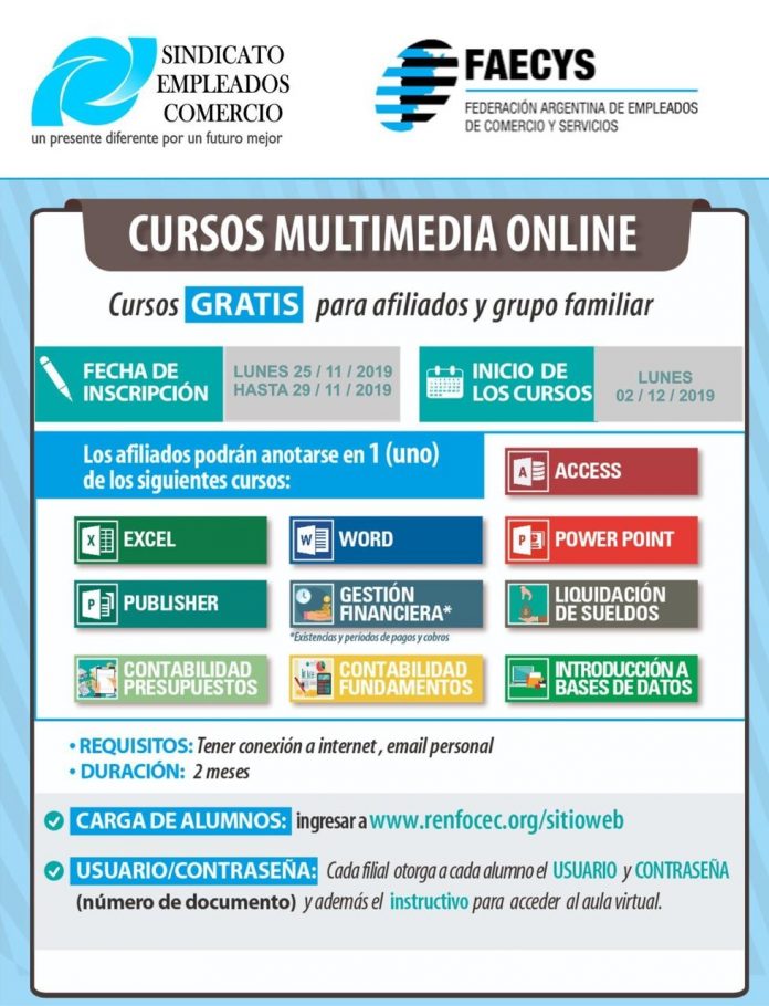 Los ha organizado la filial Zárate, a la que pertenecen empleados de comercio de Exaltación de la Cruz. Los interesados en asistir a los cursos mencionados, tienen que comunicarse de lunes a viernes entre las 8 y 16 horas al 03487-423294.