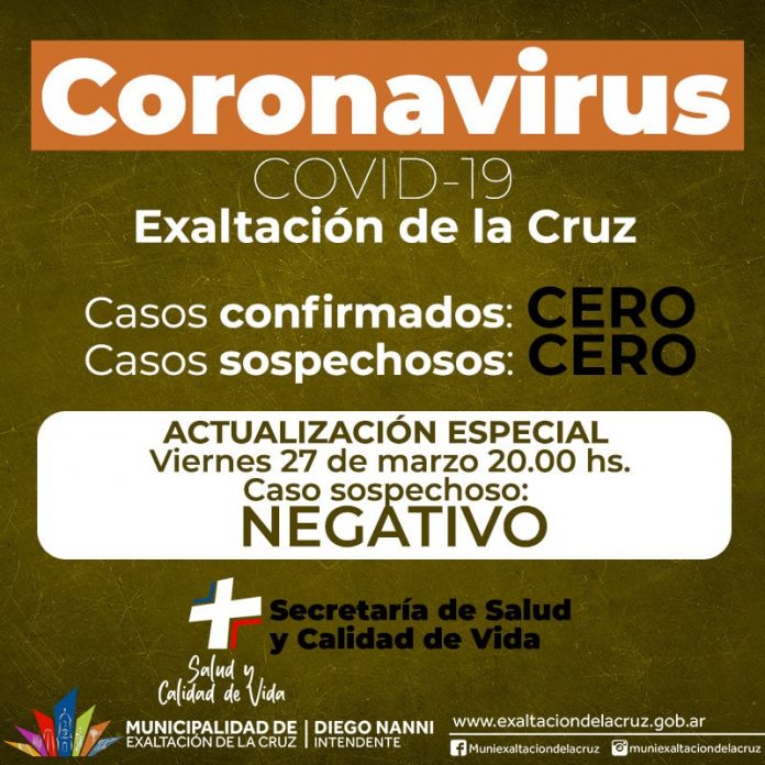 Luego del análisis de las muestras correspondientes a una vecina de Exaltación de la Cruz, que fueran remitidas al laboratorio del Instituto Malbrán, fue informado en las últimas horas (27-3-20) que dicho caso sospechoso de Covid-19 en nuestro distrito fue NEGATIVO.