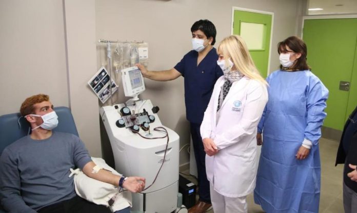 La persona recibió una dosis de 400 mililitros de plasma, proveniente del Banco de Plasma que funciona en la ciudad de General Rodríguez, como parte del tratamiento que recibe en ese nosocomio para recuperarse de su afección.