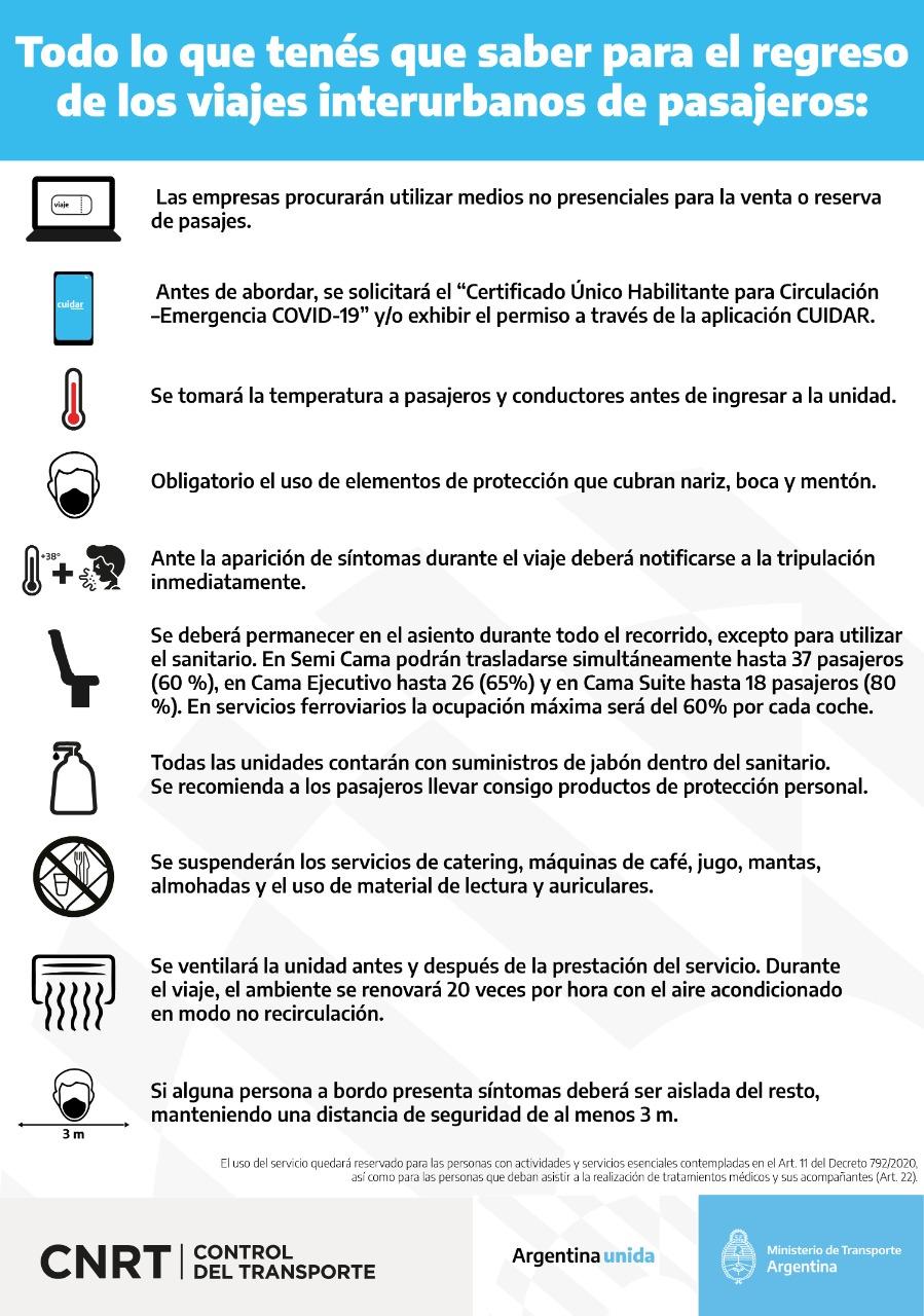 EL REGRESO CON PROTOCOLOS.La Comisión Nacional de Regulación del Transporte (CNRT), organismo del Ministerio de Transporte, fiscaliza a través de su Comité de Crisis Prevención Covid- 19 los servicios del transporte automotor y ferroviario interurbano de pasajeros de jurisdicción nacional, a partir de la Resolución 222/2020 del Ministerio de Transporte que determinó su regreso y el protocolo aprobado este miércoles por Disposición CNRT 271/2020.“Seguimos con el mismo objetivo de cuidar a todas y todos los argentinos. En esta apertura continuamos haciendo las fiscalizaciones al transporte de acuerdo a los protocolos que determinan las pautas de higiene y prevención para evitar la propagación del virus y aquellas que son para la seguridad del vehículo. Esta tarea se realiza junto a organismos nacionales, fuerzas provinciales y locales, para garantizar un transporte seguro”, detalló José Arteaga, Director Ejecutivo de CNRT.