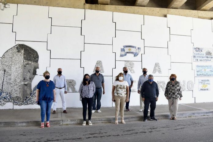 En un tramo del encuentro entre radicales, se acercaron al puente de la autovía 8 en Pavón, para mostrar la obra realizada por la artista plástica Bettina Sabbatini, en conmemoración al Día de la Soberanía Nacional, rindiéndose homenaje en el mural a los héroes del submarino ARA Gral. Belgrano.