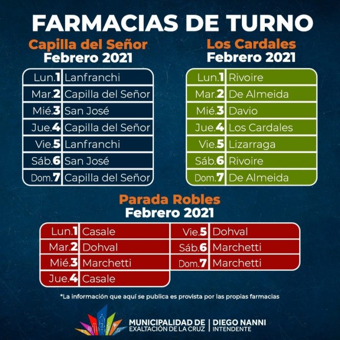 BarriosLa gente Los turnos de las farmacias de Exaltación de la Cruz en febrero By epocadigital - 02/02/2021 0 992 Facebook Twitter Google+ Pinterest WhatsApp INFO ÚTIL.