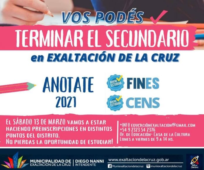 El sábado 13 de Marzo de 10 a 12 horas tiene lugar la preinscripción en distintos puntos del partido de Exaltación de la Cruz, destinada a quienes quieran finalizar el Ssecundario y sean mayores de 18 años.