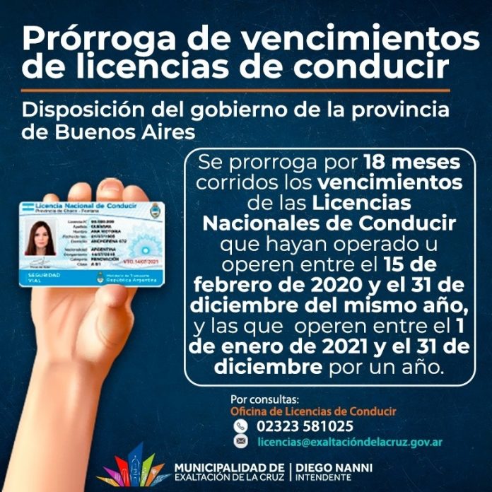 El gobierno bonaerense prorrogó los vencimientos de las licencias nacionales de conducir emitidas por la provincia de Buenos Aires, que hayan operado entre el 15 de febrero de 2020 y el 31 de diciembre inclusive por 18 meses, contados a partir de la fecha original impresa de sus respectivos vencimientos.